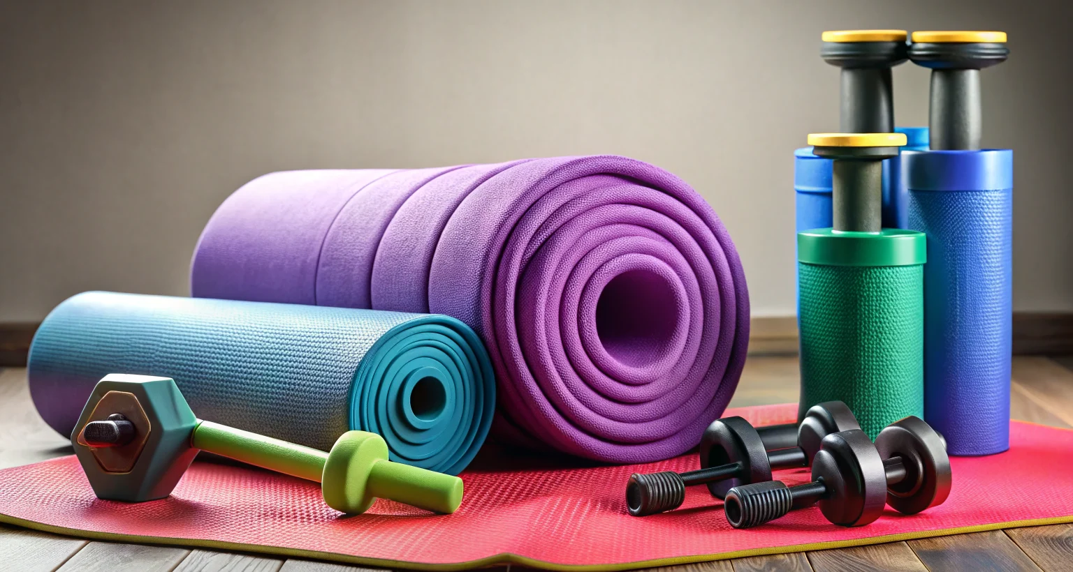 Pentru echipamentul de gimnastică, cum ar fi ganterele sau benzile de rezistență, asigură-te că le ștergi cu un cârp uscat pentru a elimina praful și urmele de transpirație. Dacă sunt fabricate din materiale precum cauciucul sau plasticul, poți folosi o soluție de apă și săpun pentru a le dezinfecta. Close-up of a clean yoga mat and resistance bands on a wooden floor, with no branding or text visible